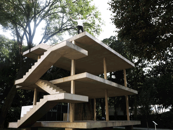 Maison Dom-Ino, in architecture is the very symbol of defying predetermined rules. Why would one build a 1:1 model, and assign rules to it's users? At the 2014 Venice Architecture Biennale, I listened to the pedagogical rhetoric of Le Corbusier and Rem Koolhaas before I cared to comply to the order defined by curators and lawyers, looking out "for your safety, sir". [note: white stair-fence, at base of staircase.]